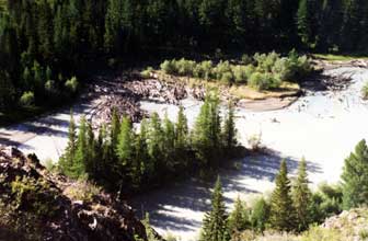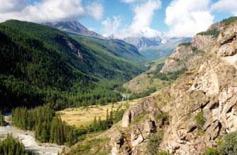 серебряная Чуя, по бокам растут сопки и возвышаются каменные скалы, а на горизонте видны снежные шапки.